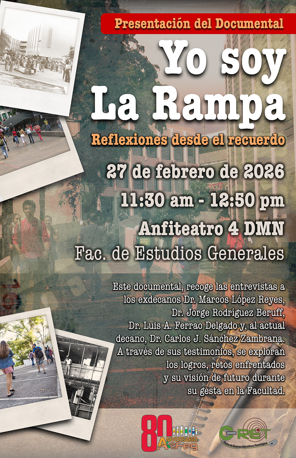 Descripción: Este documental, recoge las entrevistas a los exdecanos Dr. Marcos López Reyes,Dr. Jorge Rodríguez Beruff,Dr. Luis A. Ferrao Delgado y, al actual decano, Dr. Carlos J. Sánchez Zambrana. A través de sus testimonios, se exploran los logros, retos enfrentadosy su visión de futuro durantesu gesta en la Facultad.